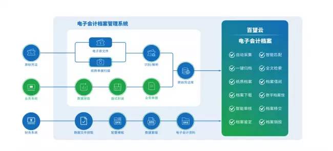 针对企业的会计档案归档难、保管难、信息共享难等痛点,百望云推出了电子会计档案解决方案,原始凭证与记账凭证自动匹配,纸电建立索引关联,实现线上自动采集、整理归档、借阅下载、移交、鉴定销毁,实现档案全生命周期数字化闭环管理,让财务告别繁琐的档案整理工作,为企业财务数字化转型工作打下坚实基础。