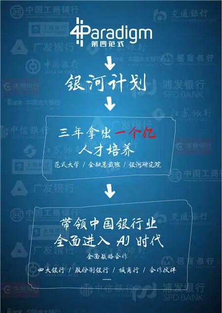 从人工智能独角兽企业第四范式获悉,该公司正在酝酿并马上推出一个“银河计划“,培养银行业AI人才。据第四范式副总裁陈斌透露,第四范式近期正与数家大型金融机构建立新一轮合作关系,以工商银行为代表的几大银行,会紧锣密鼓与第四范式签约,正式消息即将公布,中国银行业将全面进入AI提速时代。为配合这一银行业战略升级的人才需求,第四范式的“银河计划“将在3年之内拿出一个亿,在中国银行业培养一千位AI人才,包括银行从业人员、合作伙伴,原有范式大学、金融总裁班的规模和能量也将扩大以承载更多需求。