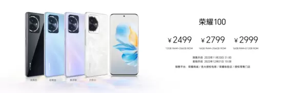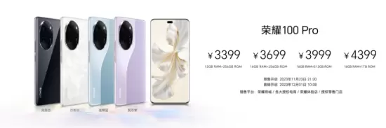 荣耀100售价为2499元(12GB+256GB版本); 2799元(16GB+256GB版本);2999元(16GB+512GB版本)。荣耀100Pro售价为3399元(12GB+256GB版本); 3699元(16GB+256GB版本);3999元(16GB+512GB版本);4399元(16GB+1TB版本),将于11月23日21:00在荣耀商城、各大授权电商、荣耀体验店及授权零售门店开启限量预售,12月1日10:08正式开售。