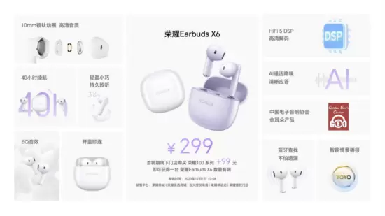 本次发布会上,还有荣耀手表4 紫色表带款、荣耀Earbuds X6真无线耳机、荣耀X50i+以及荣耀亲选 ongo智能摄像头京东小家版等产品发布上市。十天超长续航,esim独立通话一表双待的智能手表——荣耀手表4,加49元得原价99元精美紫色表带。荣耀Earbuds X6真无线耳机,纯净音质定制调音、40小时超长续航, 2023年12月1日正式开售,另线下门店购买荣耀100系列+99元即可获得一台荣耀Earbuds X6(售完为止)。一亿像素、轻薄高品质OLED颜值新机荣耀X50i+,12+256GB版本1599元,12+512GB版本1799元。荣耀亲选 ongo智能摄像头 京东小家版,2.5K细腻画质、双向实时通话、AI智慧侦测,建议零售价199元,首销2023年12月12日-15日期间,到手尊享价99元。