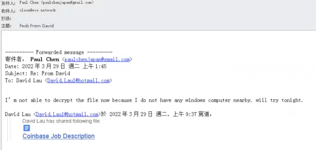 下面以一起典型的Lazarus针对加密行业的鱼叉攻击为例进行分析。Lazarus通过邮件附件或链接的方式,诱导目标工作人员下载恶意压缩包,并执行压缩包中的恶意文件。