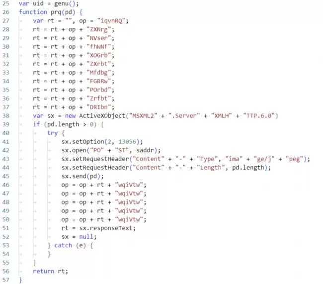 RgdASRgrsF.js是Lazarus典型的二阶段脚本,其功能非常简单,生成随机的UID后与服务器通讯,然后循环接受服务器的命令并执行;所执行的命令通常一些收集系统信息的命令: