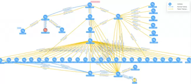 尽管如此,Lazarus已完成了超10亿美元的资产转移和清洗,他们的洗钱模式分析如下。以Atomic Wallet事件为例,去除黑客设置的技术干扰因素后(大量的假代币转账交易+多地址分账),可以得到黑客的资金转移模式: