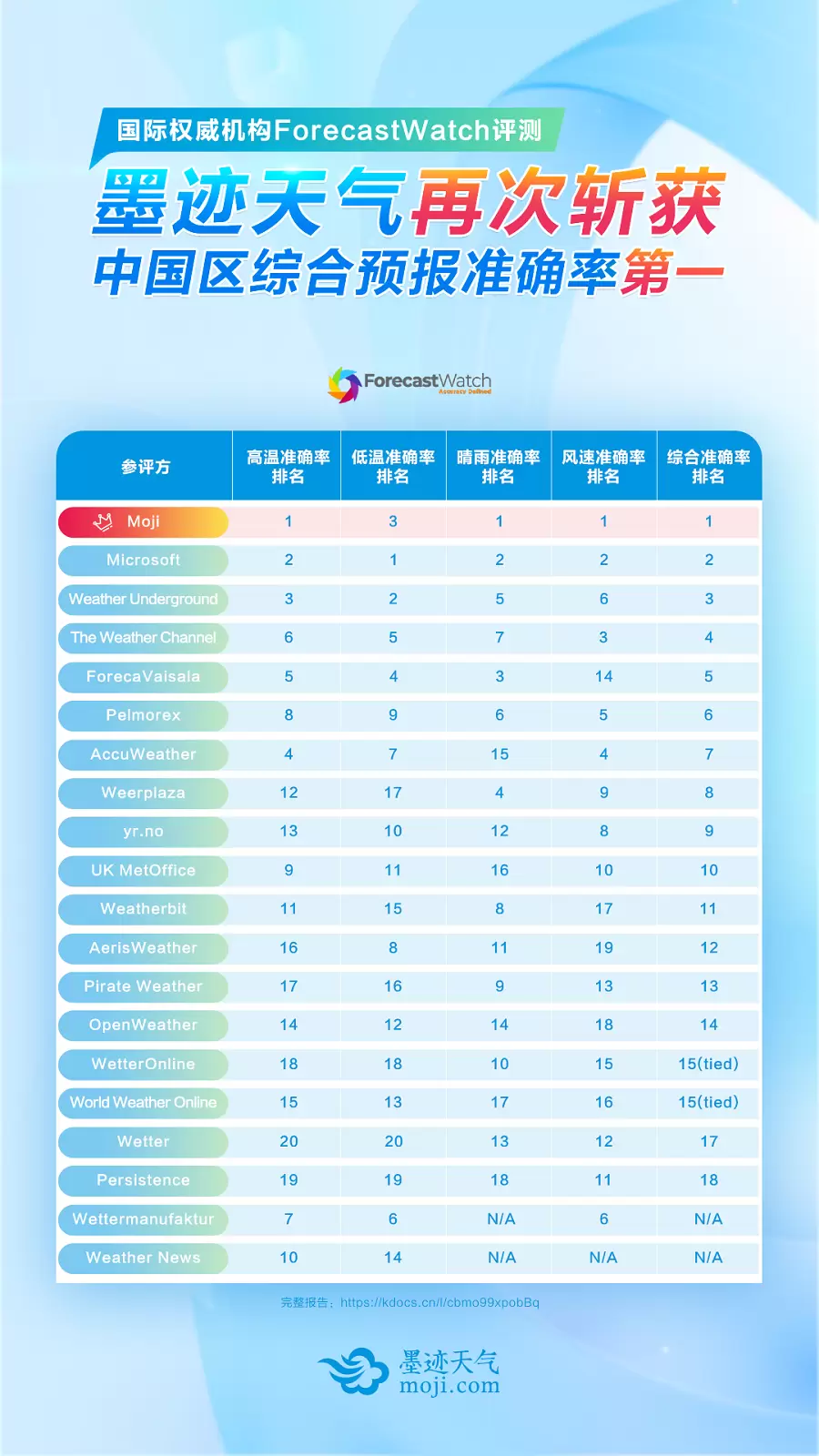 近日,国际权威气象服务评测机构ForecastWatch公布了全球气象企业在中国区预报准确率评测结果,墨迹天气凭借过硬的技术能力在一众国际气象巨头中脱颖而出,再次斩获了中国区综合预报准确率全球第一的成绩,且在高温、晴雨、风速等单项预测中准确率均排名第一,其精准且稳定的天气预报能力又一次得到了肯定。这也正代表着墨迹天气在气象服务领域的“护城河”效应愈发显著,其品牌实力再次得以印证。