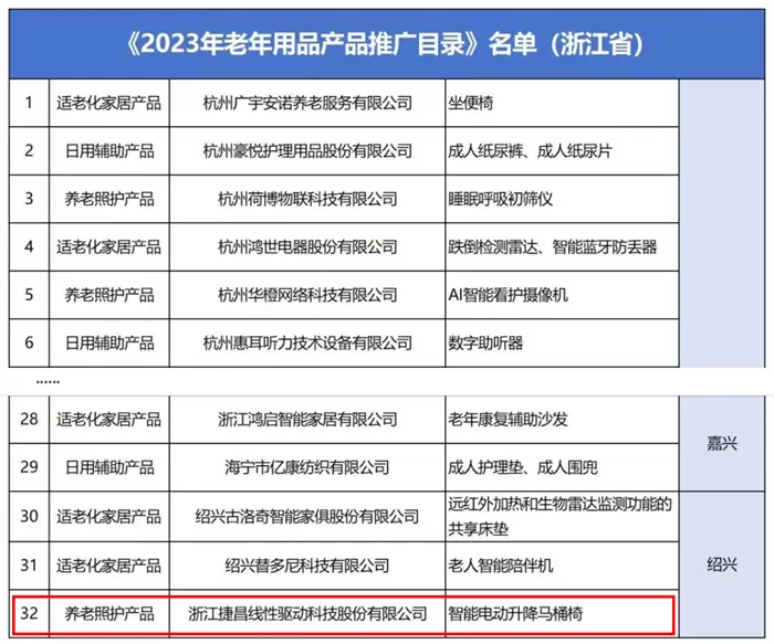 捷昌驱动自主创新研发的“智能升降电动马桶椅”经过省级工业和信息化主管部门及行业组织推荐、专家评审、面向社会公示等程序后成功入选。据悉,这是继2022年升降洗澡椅成功入选后,捷昌驱动的养老护理产品再度荣获殊荣。