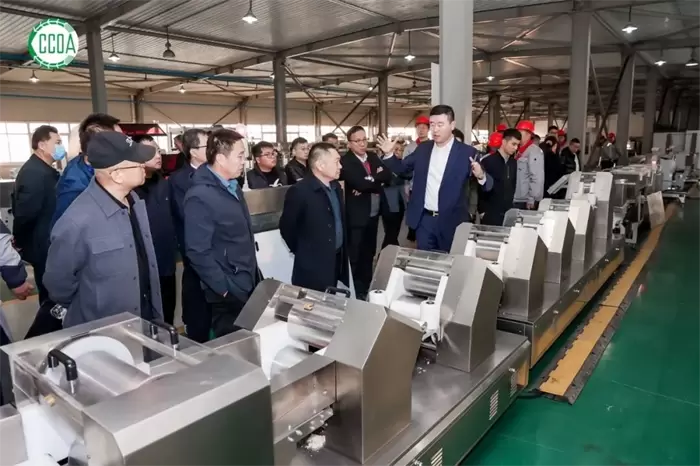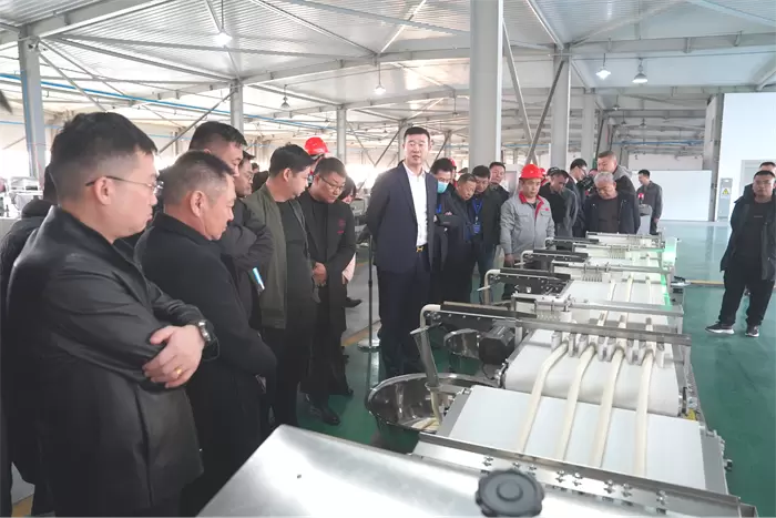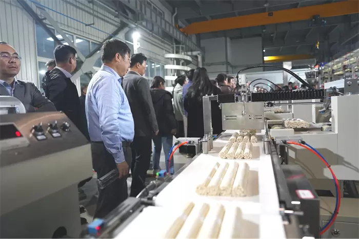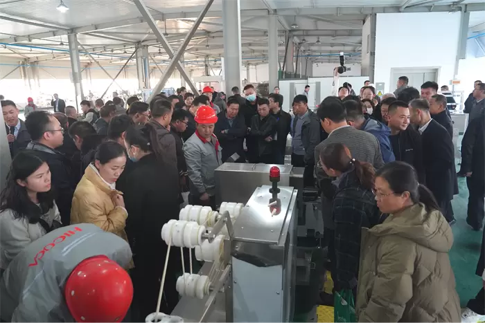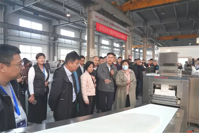 在装配车间现场,海科佳手延面自动化生产线、米粉生产线、鲜湿面生产线、馒头生产线以及食品包装连线稳定运行,让大家切实感受到了现代化米粉制品生产装备的创新先进性。