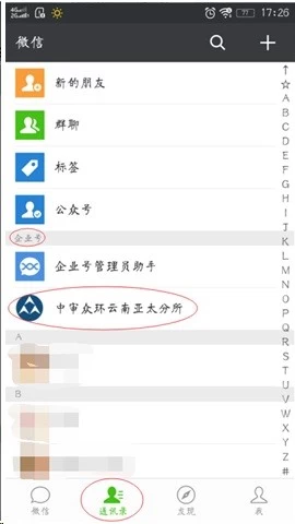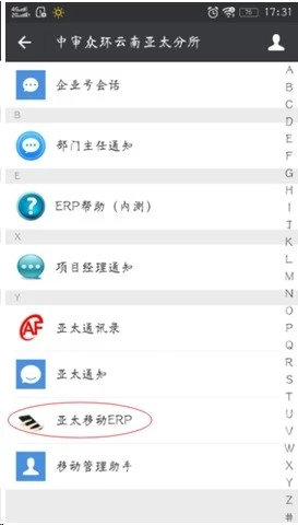 打开微信,进入通讯录,在最上面的企业号中找到中审众环云南亚太分所,进到企业号中找到亚太移动ERP(不同职级的人在企业号中有不同数量的应用,以后还将开发增加新应用)。
