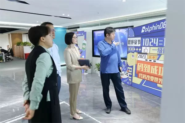 在 DolphinDB 副总裁陈静华的陪同下,陆家嘴管理局众位领导参观了 DolphinDB 办公区域。