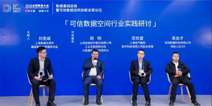 在“可信数据空间行业实践研讨”圆桌论坛中,由上海数据交易所基础架构与数据库总监刘圣威主持,上海宝信软件股份有限公司工业互联网研究院大数据技术研究所所长周明、上海电气集团数字科技有限公司副总经理范世望、深圳数鑫科技创始人&CEO吴会才等行业专家分享了他们对于可信数据空间应用于各个行业的深入思考以及各自企业如何开展数据空间的建设,比如建设范围、阶段、技术选型以及遇到挑战。