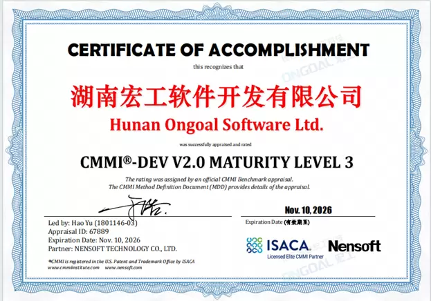 近日,宏工科技子公司湖南宏工软件成功通过CMMI三级认证并正式获得资质证书,斩获全球软件领域最权威的认证之一,标志着宏工科技在软件技术开发、研发管理、项目管理等多方面获得国际权威认证。