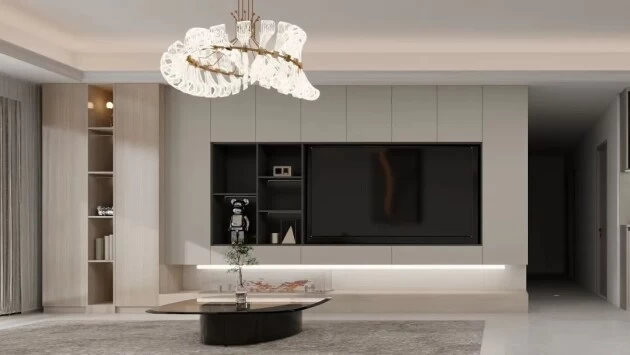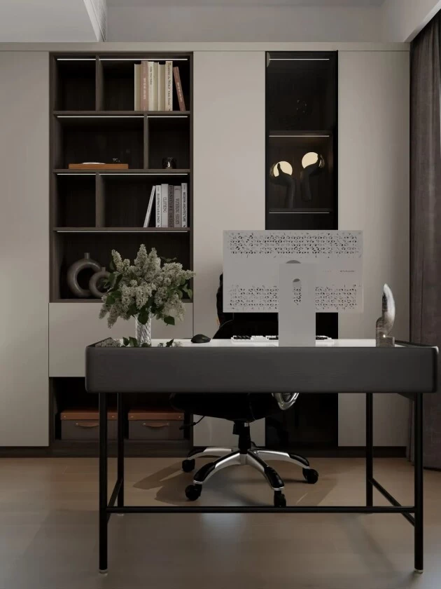 极简的设计理念贯穿于整个场域布局,纯粹的色彩将现代都市人群所需的生活模式表现得淋漓尽致。在柜体展示格中放置潮玩艺术品,或是放置书籍,加以灯光点缀,便构成一幅恬然雅致的画境。再于桌面放置些许绿植,让空间流淌出无限生机与活力。