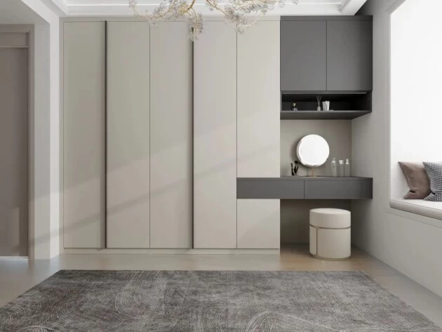 延续全屋低饱和的色彩基调,为空间注入优雅而平和的舒适视感。临窗位置设置梳妆台,通过“梳妆台+收纳柜+衣帽间”组合设计,建构起井然有序的空间秩序,实现空间功能的延伸拓展。