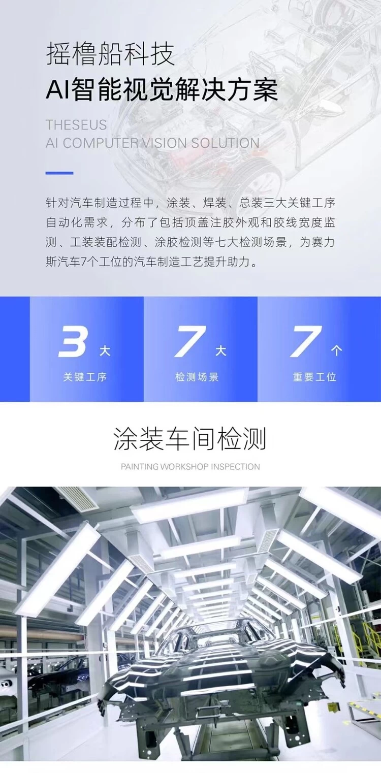 2022年8月,摇橹船科技与赛力斯汽车签订合作协议,为问界M7车型的生产制造提供AI智能视觉解决方案,助力赛力斯汽车4.0智慧工厂打造。