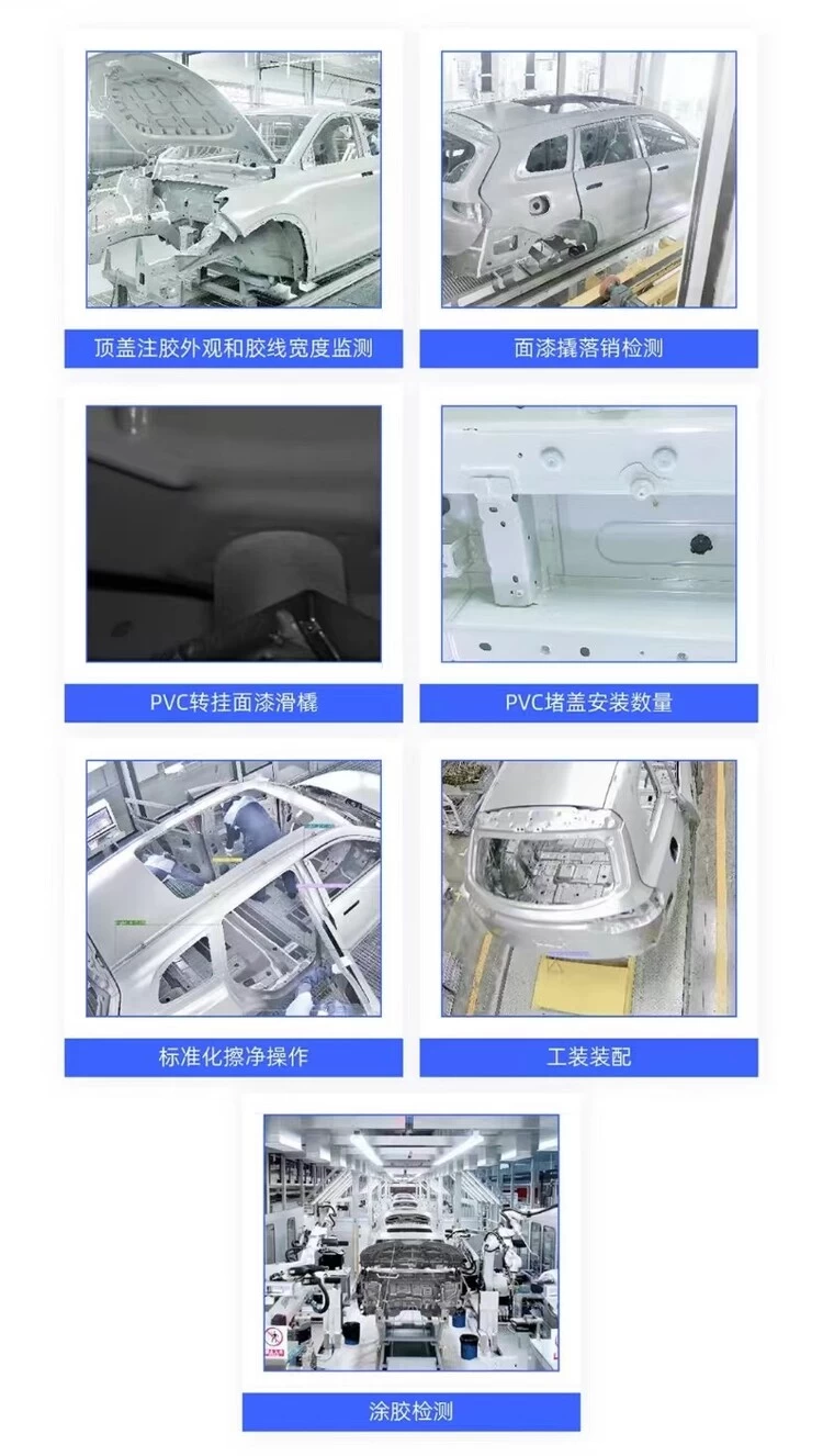 赛力斯智慧工厂内,涂装、焊装、总装三个不同工位的七个不同车间,都能看到摇橹船科技检测产品的身影。摇橹船科技AI智能视觉解决方案于2022年8月至2023年10月在赛力斯汽车工厂投入使用,为赛力斯汽车制造工艺升级助力。