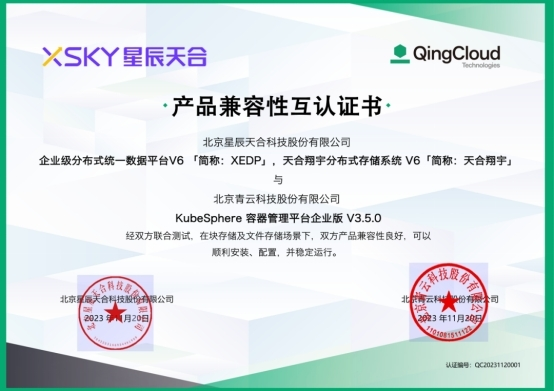 近日, KubeSphere 企业版容器平台成功完成了与北京星辰天合科技股份有限公司(简称:XSKY 星辰天合)的企业级分布式统一数据平台 V6(简称:XEDP)以及天合翔宇分布式存储系统 V6(简称:天合翔宇)兼容性互认证,进一步丰富了企业在容器技术及容器数据存储上的选择。