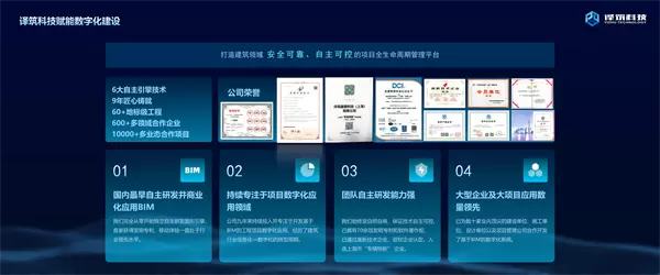目前译筑科技的发展方向一是BIM轻量化技术;二是无代码体系,是专注于工程建设行业的无代码建设,如何将工程建设行业现实的场景与无代码进行融合;三是通过数据沉淀为用户提供数据服务。以下是近些年译筑科技获得的认证与成果。