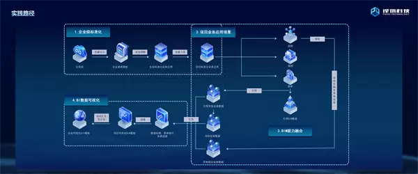 基于译筑云智慧建造整体解决方案,能够有完整的实践路径在项目中逐渐开始推广数字化应用。首先通过企业的数据建设能力,形成企业的标准化应用,分发给企业中的各类项目,各类项目通过现场表单填报,通过不同的配置,通过一些自动化的规则能力及与BIM数据的结合引用,形成整体的业务数据,最终将内部数据进行汇总,再通过数据处理的手段,最终形成BI可视化看板。之后通过各个项目数据的集成,自然而然地形成企业级可视化数据看板。通过以上应用路径,从企业的标准化建立到最后数据化呈现,形成闭环。