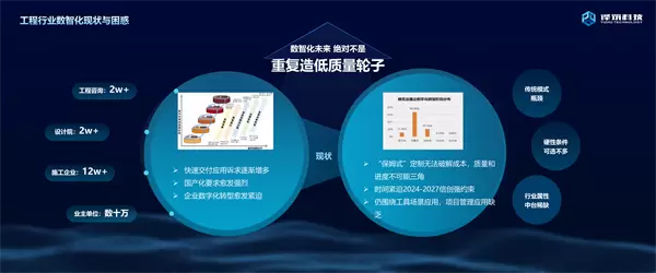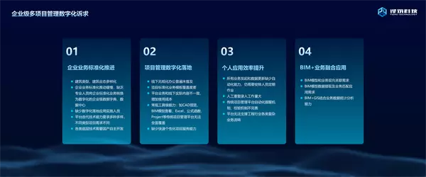 企业目前遇到最大的问题就是企业业务标准化没办法在所有项目中能够很好地去推进。第二个是项目管理,我们经常提到项目管理数字化,希望它能够落地,但是一线人员会发现,除了一些标杆性项目和超大型项目以外,整体项目的线下规划中,普及度相对来说比较低,还未完全覆盖。第三个也是被很多从业人员吐槽的:建筑行业有很多数字化平台,但是这些平台不好用,不方便用,反而减缓工作效率。最后一点,很多专家提到BIM应用仅在BIM轻量化展示方面有一些成果,从13年开始到23年,这10年的时间也一直在发展,但是BIM作为结构化数据很强的东西,如何与业务进行深度融合,怎样把BIM能力应用到项目管理中,这也是最近几年大家一直在探索、寻求解决方案的问题。