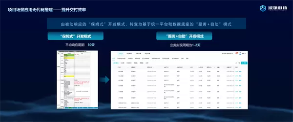 通过我们前期与用户合作的经验,很多企业定制开发交付周期需要一年以上,但是现在越来越多的企业要求快速交付。比如说当前许多企业签完合同以后需要立马部署,一个月至三个月以内就需要上线,这种诉求通过传统的开发方式,确实没有解决办法,无法解决同等质量和进度的协同推进问题。