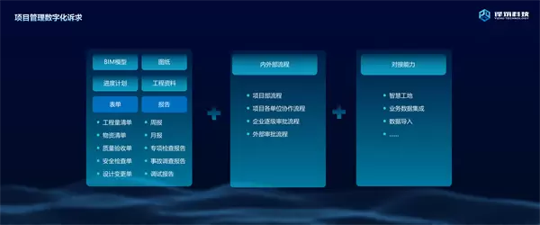 第二个诉求是项目管理数字化落地,很多从业人员有一些感触,就是项目的管理自动化需要去推动。项目管理自动化分为三个部分,第一个是工作内容,包括BIM模型、图纸、各类报告等。第二个是有非常多的流程、业务需要通过。第三个需要有一些推进能力,例如智慧工地的数据,外部应用数据要重建,数据要导入进来。通过这三个方面,能够实现数字化,推动项目管理数字化进行。