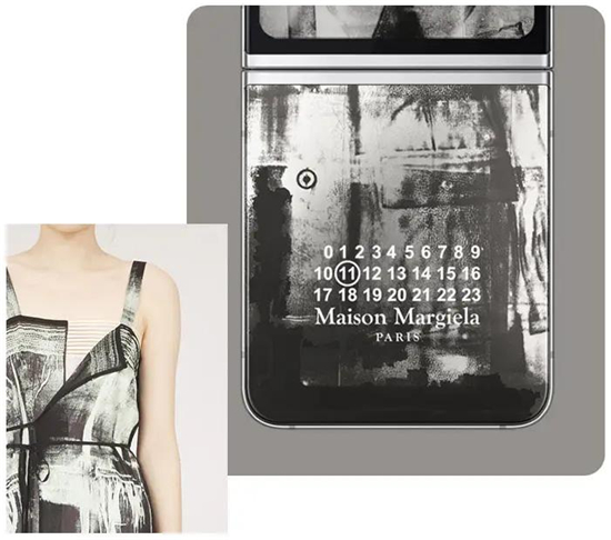 三星Galaxy Z Flip5 Maison Margiela限量版将Maison Margiela的解构主义时尚潮流和高级时装风格融入了尖端科技之中。机身背板上Maison Margiela外套的内部纹理效果,在银色和金属光泽的映衬下,通过半透明的设计巧妙地表达出服装中的隐藏结构和细节。这也正是Maison Margiela惯用的错视画艺术效果(Trompe-l’oeil),即通过解构表面来展示隐藏的元素,打破了传统的视觉观感,让人耳目一新。同时,背板中上还加入了Maison Margiela标志性的“数字标签”图案,圈中的数字“11”也与三星Galaxy Z Flip5 Maison Margiela限量版的配饰属性相吻合。