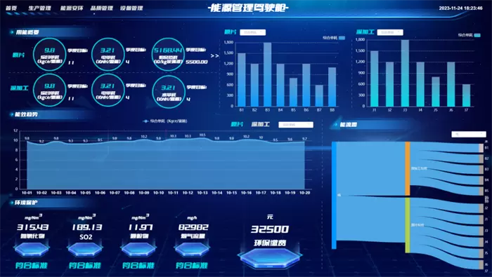 「AI+能碳智能化」结合节能改造需求,聚焦于保温系统和风道优化,考虑总风量需求,智能调节变频器功率,将原工人手动阀改为电动控制阀,利用算法优化末端风量配比,以达到节能的效果降低企业运营成本。展湾科技基于其工业互联网平台打造的“能源管理驾驶舱”也能够及时掌握能源信息,实时反馈及决策。