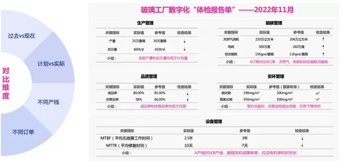 经过数字化的“体检流程”后,负责人会看到一张全面的玻璃工厂“数字化体检报告”,报告覆盖生产、品质、设备、能碳、安环五大模块,针对每个模块的关键指标也会有详细的诊断结果,工厂的“病症”一目了然。