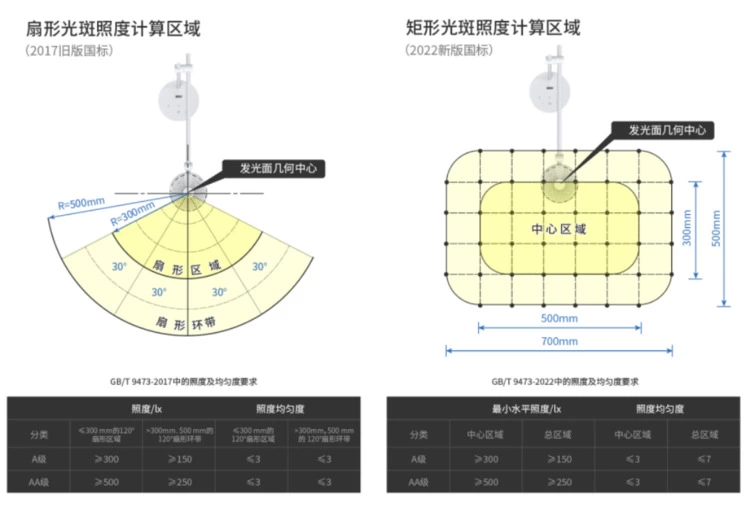 2022新版照度均匀度面积约为0.35m2,呈矩形,更符合真实使用场景,比旧版国测量面积增加了35%左右。