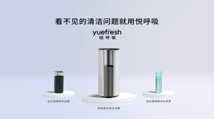 以悦呼吸明星产品“全净器”为例,悦呼吸全净器颠覆传统过滤式净化器科技,采用独家专利——益生菌净化技术,每次喷洒2000000个环境益生菌益生菌,悦呼吸的环境益生菌以病原菌、过敏原等有害物质为营养来源,进行生长繁殖,使得有害物质被分解。