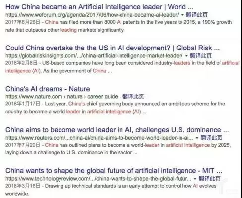 在搜索引擎中输入“China”、“AI”、“leader”几个关键字,很快,匹配得到的海外新闻词条数不胜数。粗略查看标题,尽是外媒有关“中国或将超越美国成为全球 AI 领导者”的新闻,尤以 2018 年更甚。