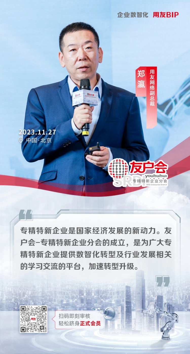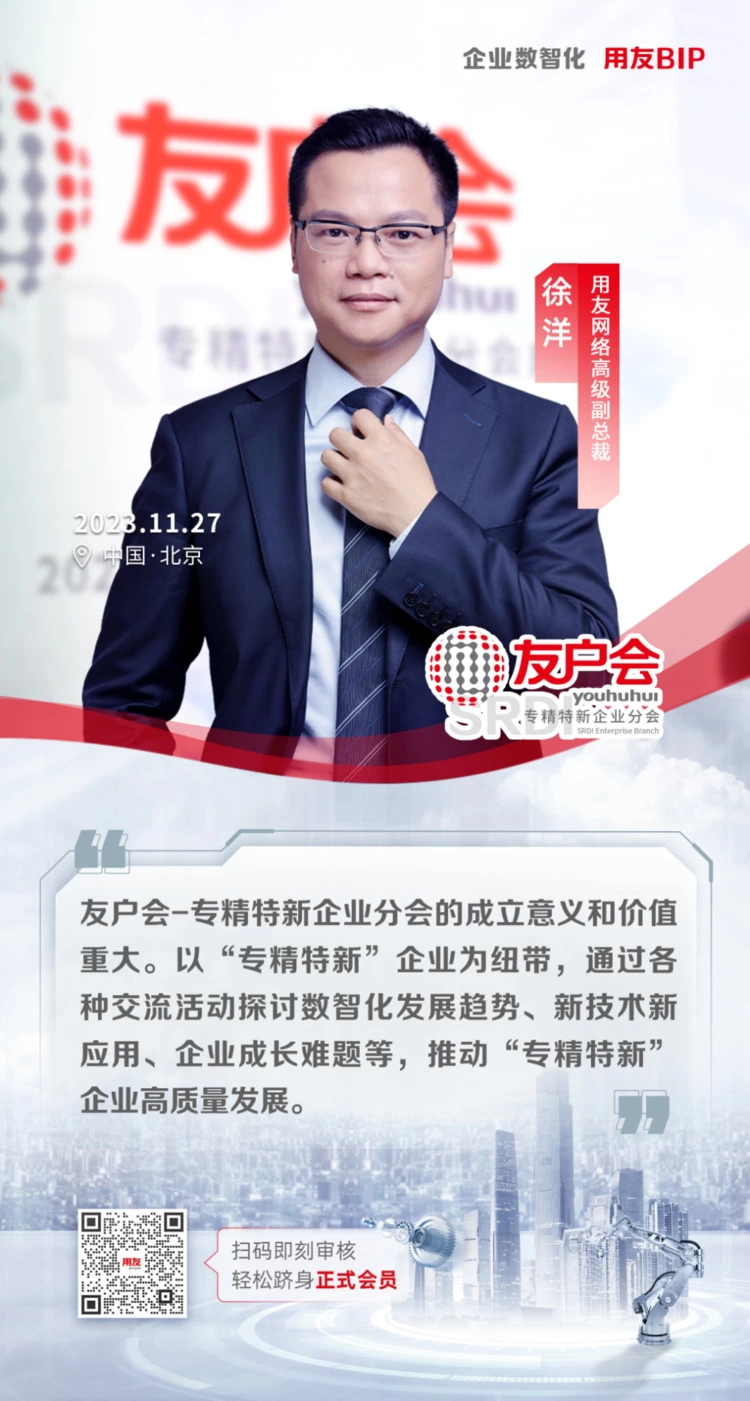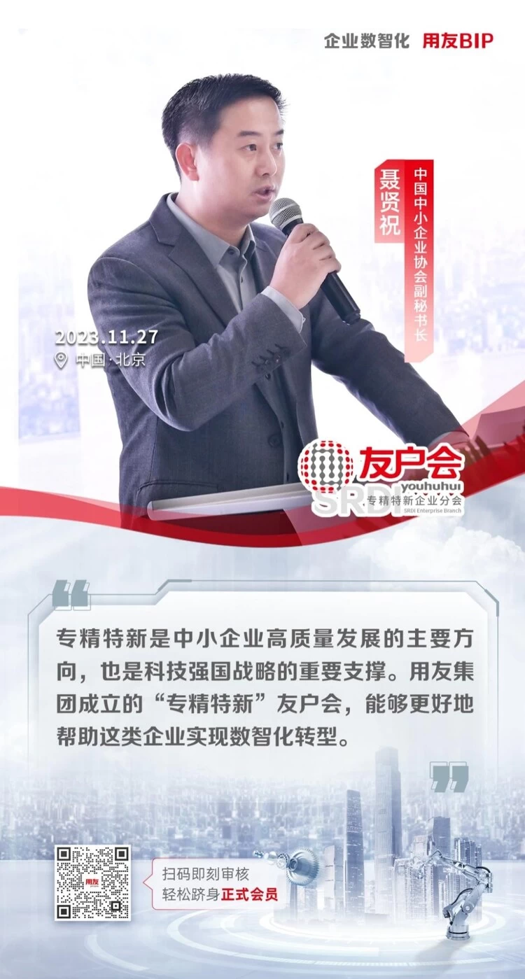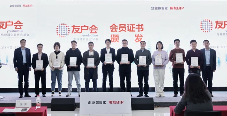 在推动中小企业高质量发展和实现国家战略部署的关键时刻,用友网络于11月27日正式宣布成立“友户会-专精特新企业分会(SRDI Enterprise Branch)”。这一举措不仅是对专精特新战略的积极响应和广泛推广,也标志着用友用户之间互助共赢的新篇章,为专精特新企业在数智化转型升级中提供了强大的支持和平台。