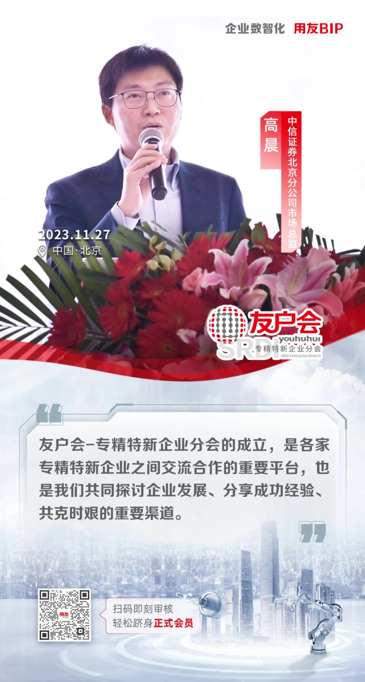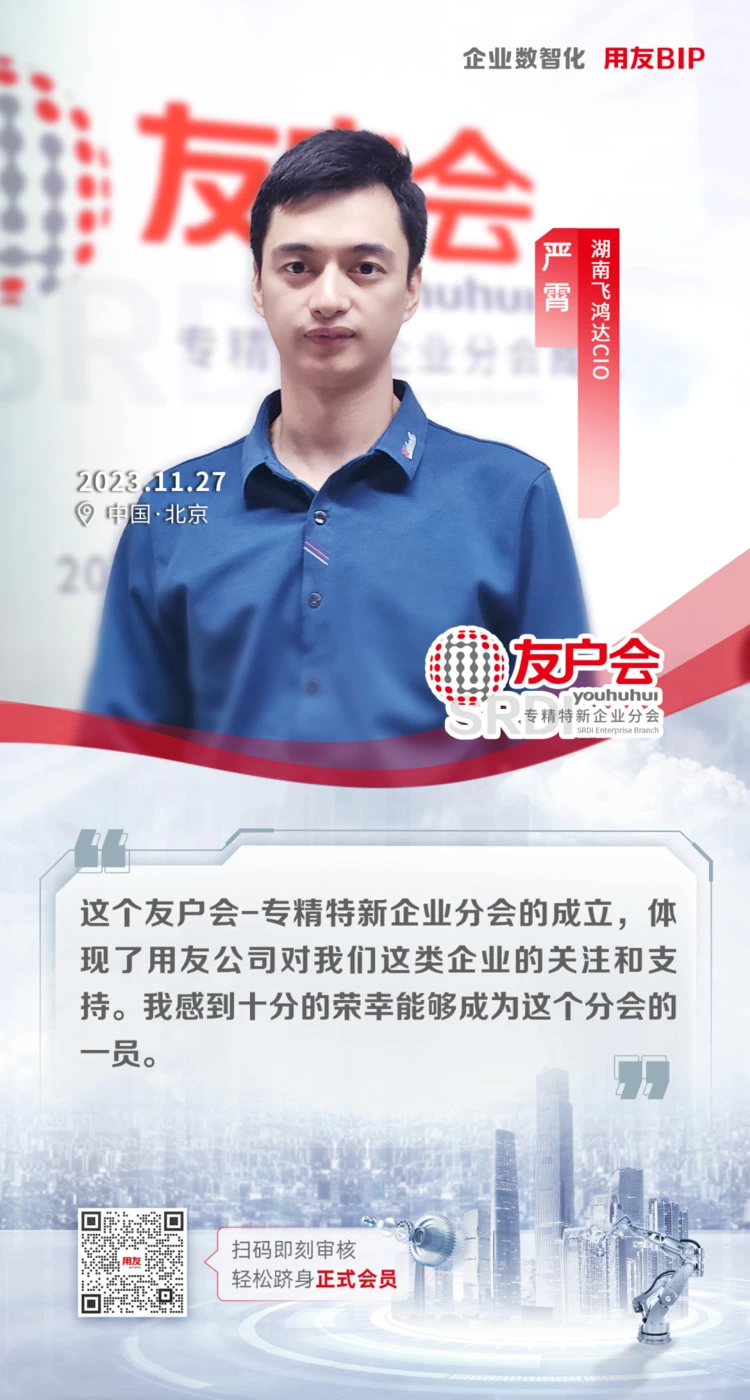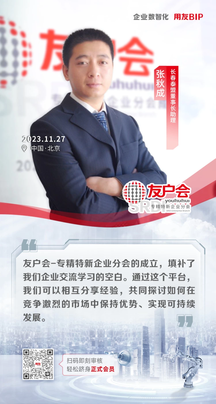 在推动中小企业高质量发展和实现国家战略部署的关键时刻,用友网络于11月27日正式宣布成立“友户会-专精特新企业分会(SRDI Enterprise Branch)”。这一举措不仅是对专精特新战略的积极响应和广泛推广,也标志着用友用户之间互助共赢的新篇章,为专精特新企业在数智化转型升级中提供了强大的支持和平台。