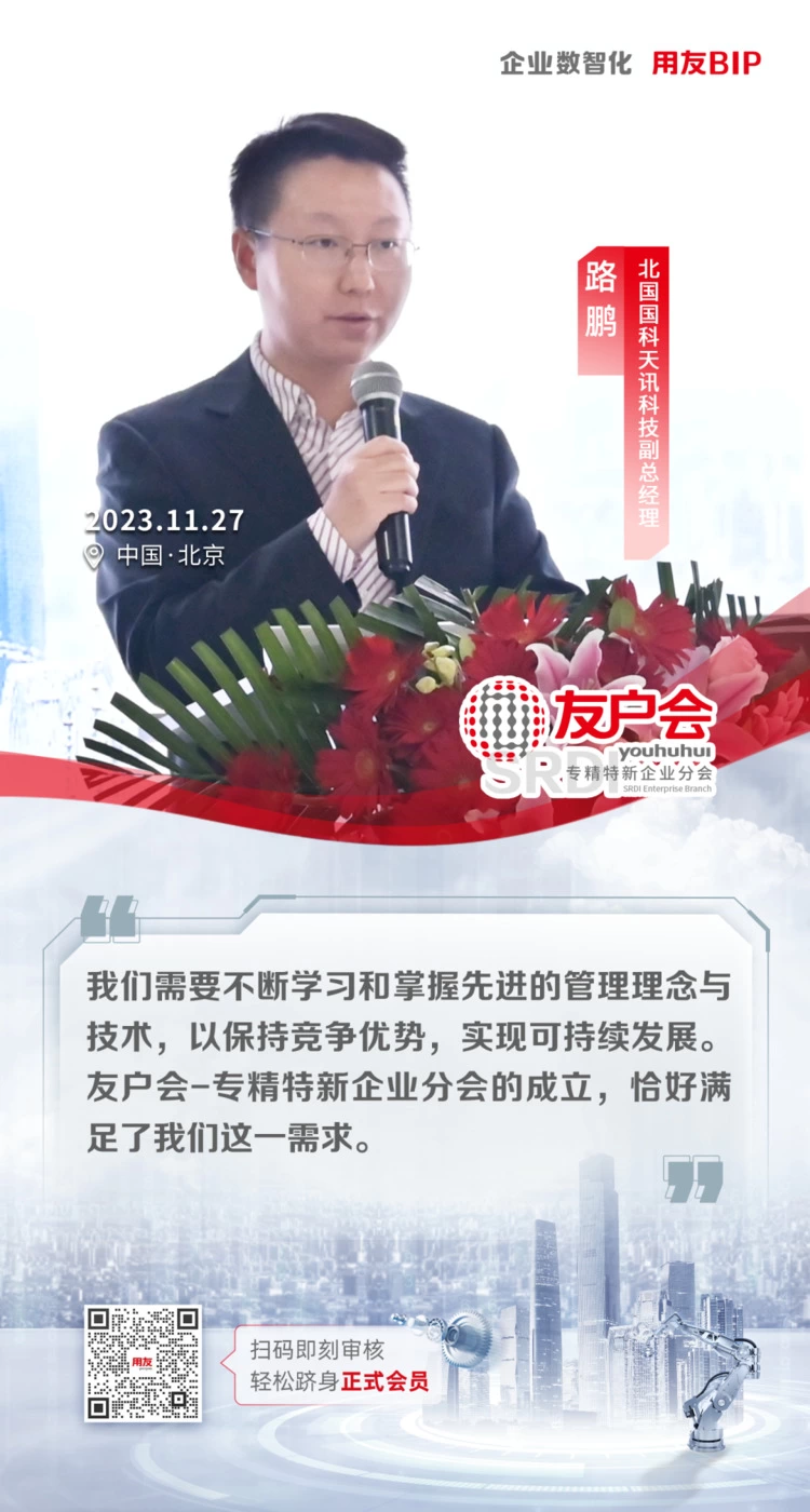 北京国科天迅科技副总经理路鹏先生表达了对平台的期待:“感谢用友为我们提供了这个平台,让我们有机会与其他专精特新企业进行交流和学习,这个分会的成立,为我们在数智化转型的征途上提供了宝贵的支持和资源。”