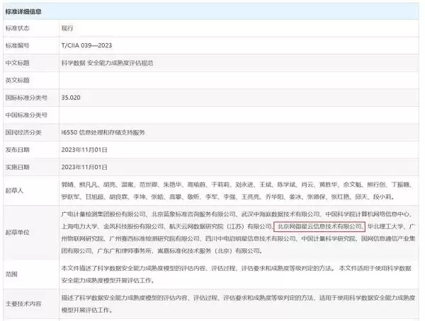2023年11月1日,中国信息协会发布《科学数据 安全能力成熟度评估规范》团体标准,并于11月1日起开始实施。网御星云作为主笔单位深度参与标准的编制,牵头标准起草、修订等一系列工作。