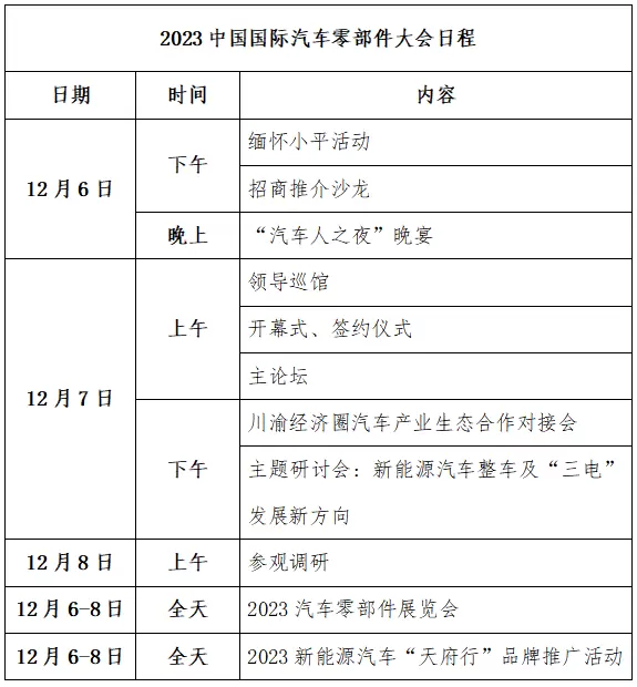 会议期间将举办成渝地区双城经济圈汽车产业深化合作对接会、招商推介沙龙、新能源汽车整车及电池、电机、电控“三电”发展新方向主题讨论、新能源汽车“天府行”等10项主题活动,同时举办投资推介和招商项目签约活动,发布汽车内控系统、电子系统、内饰件等重点产业链合作项目,集中签约一批汽车零部件产业项目。