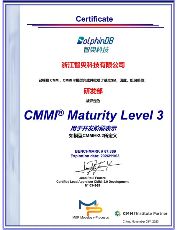 荣誉快讯 DolphinDB 正式通过 CMMI 3级认证!