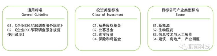 企业 ESG 尽职调查系列标准包含通用标准、投资类型标准、目标公司产业类型标准。ESG 尽职调查应当首要参照通用标准。根据其投资类型和目标公司产业类型,还应同时参考一份投资类型标准和一份目标公司产业类型标准。