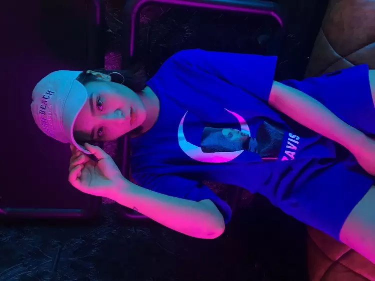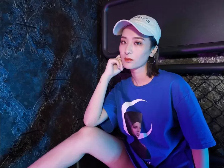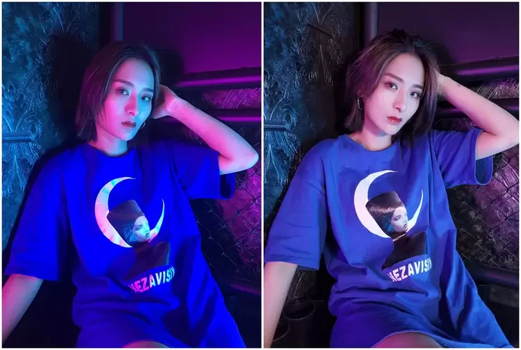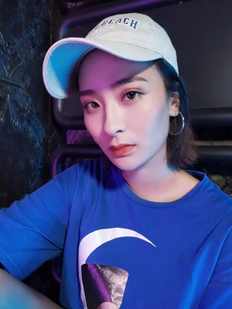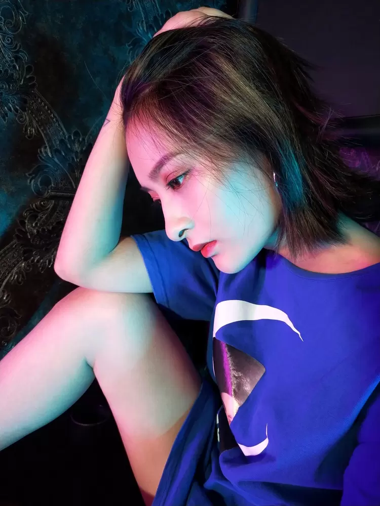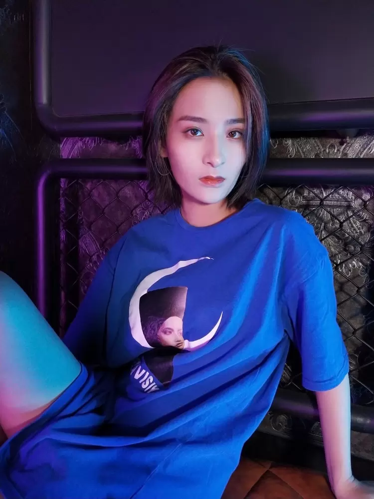 为了更清晰直观地感受一下区别,再来看一张同角度同姿势的直出照片对比。能发现,美图T9手机拍出的照片,画面明显更干净,蓝紫色的光反而为照片平添了高级感;而其他手机拍出的照片中,光线杂乱,并且让脸部出现了油光感。
