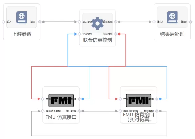 FMU仿真接口工具集可以帮助工程师便捷地实现复杂装备基于FMU的多学科联合仿真,并在联合仿真的基础上进行仿真设计优化。这个工具集的计算模板主要包括四类组件:上游组件、下游组件、联合仿真控制组件和FMU组件。这些组件之间的连接和数据交互关系保持一致。通过这些组件的组合使用,工程师可以实现基于FMU的联合仿真,提高复杂装备的设计效率和性能表现。