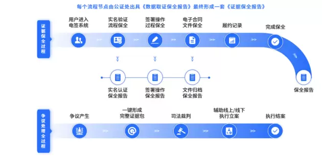每个流程节点由公证处出具《数据取证保全报告》最终形成一套《证据保全报告》。
