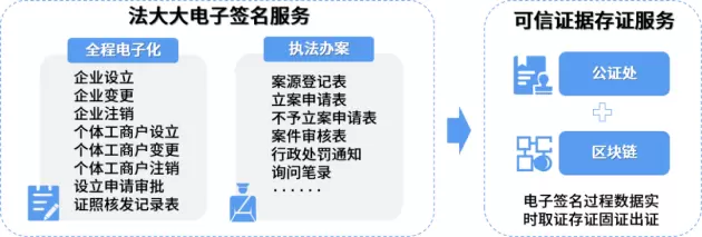 基于法大大可信电子签署能力平台、可信电子证据存证平台,围绕市场监管,如商事登记、执法办案、特种设备、内部审批等重要应用领域,提供数字政府统一公共能力平台。