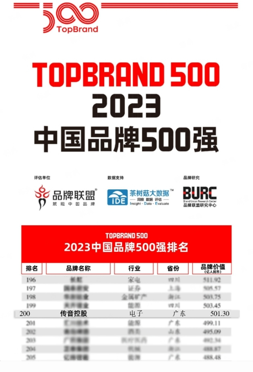 日前,2023第十七届中国品牌节在杭州盛大开幕,6000余名政、商、产、学、媒等各界人士共同见证中国品牌力量。会上正式发布了《TopBrand 2023中国品牌500强》榜单,传音控股荣登该榜单,排名第200位,彰显了强大的品牌综合实力。