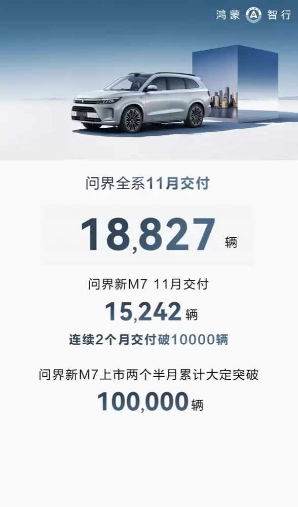 自从今年5月,问界成为最快十万辆下线的中国新能源品牌,创造了业内瞩目的“问界速度”后,市场反响可以说是越来越好。11月,问界全系交付18,827辆;其中,问界新M7交付新车15,242辆,累计交付超28,000辆;11月27日,官方宣布问界新M7累计大定已突破10万辆,持续刷新纪录。值得一提的是,为了回馈广大消费者的支持,问界官方推出了两款全新问界新M7 MAX后驱智驾版车型,给消费者提供了更多购车选择的同时,延续了购车权益政策和提车关爱计划。