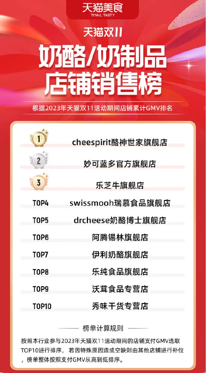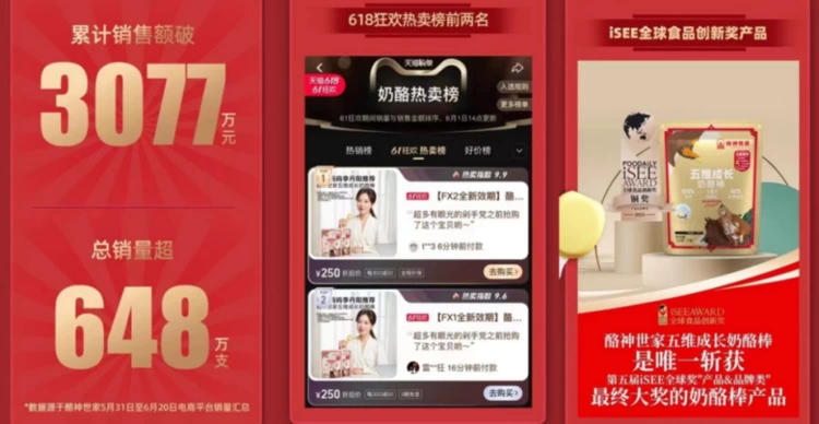 五维素颜奶酪的推出标志着酪神世家对其“五维营养”体系的不断深耕。“五维营养”是酪神世家于国内首创的营养体系,首次提出并付以产品实践,致力于为国人提供五维营养支持、为中国家庭提供科学营养解决方案。在五维素颜奶酪之前,酪神世家以其沉淀三十余年的科研积累,在2022年推出了面向儿童的“五维成长奶酪棒”,助力儿童的骨骼生长、自护发展、肠道消化、脑力发育及视力保护五个营养维度。这款奶酪棒是酪神世家商业版图的入局产品,亦是“五维营养”体系的首位成员,在2023年618期间摘下了天猫与淘宝双平台奶酪制品榜单的销量冠军。截至新品发布的2023年11月,五维成长奶酪棒仍在天猫销冠的位置上屹立不倒。天猫双十一活动期间,酪神世家天猫旗舰店在奶酪/奶制品店铺销售榜中排行第一。