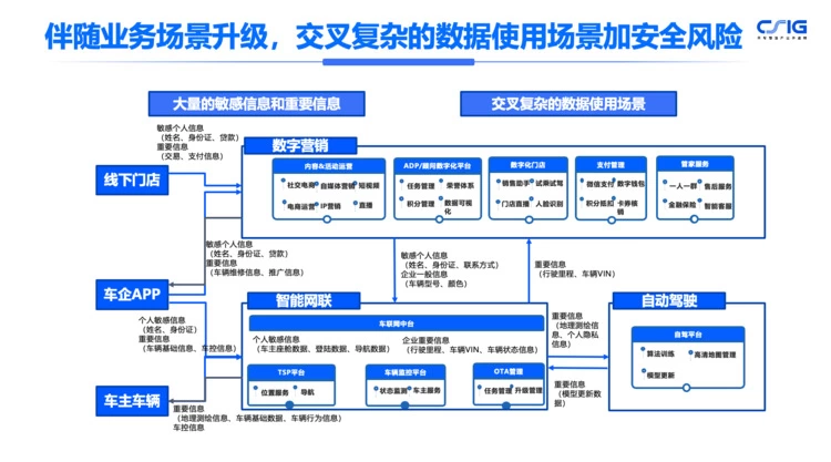 车企业务的全面上云,意味着网络边界更加开放,潜在的网络攻击面增加,企业的核心数据资产将会面临更多攻击风险。特别是随着用户触点的增多、更广泛的业务场景互联以及大模型在汽车行业逐步应用,交叉复杂的数据使用场景进一步增加安全风险。同时,车企也面临越来越严格的合规监管。