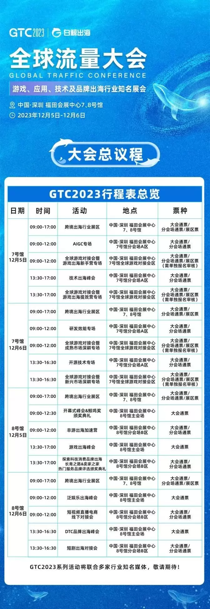 12月5-6日,由白鲸出海主办的 GTC2023 全球流量大会将在深圳福田会展中心 7&8 号馆举办。