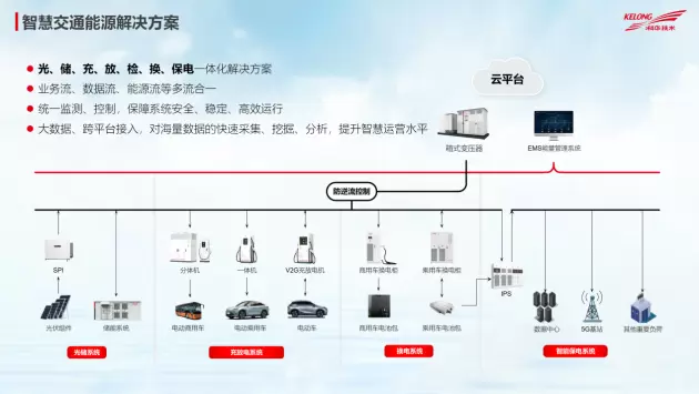 顺应行业发展趋势,科华基于自身丰富的产品家族,推出集光、储、充、放、检、换、保电等系统于一体的智慧交通能源解决方案;并通过EMS能量管理平台,实现业务流、数据流、能量流等多流合一,保障系统安全、稳定、高效运行,提升能量利用与智慧运营水平。面向不同场景需求,该方案还整合包含了液冷超级储充、移动储充、光储充放检、V2G充换一体等子方案,能够灵活满足市场所需的极速充电、车网互动、削峰填谷、电网扩容、电池检测、快速部署等不同功能要求。目前,科华智慧交通能源解决方案及衍生子方案,已广泛应用于全国各地。