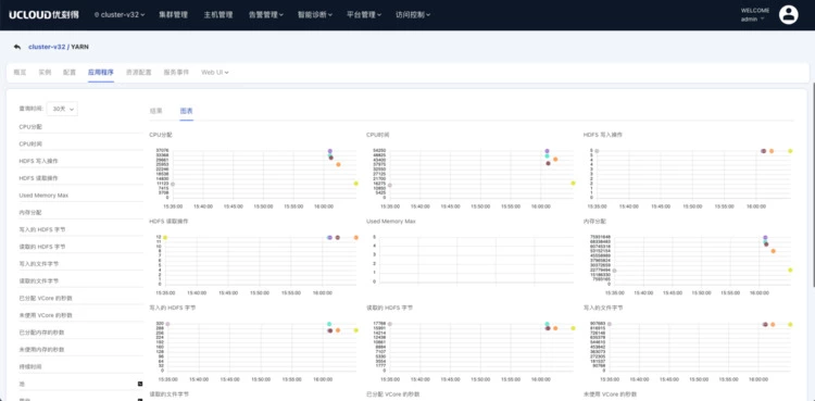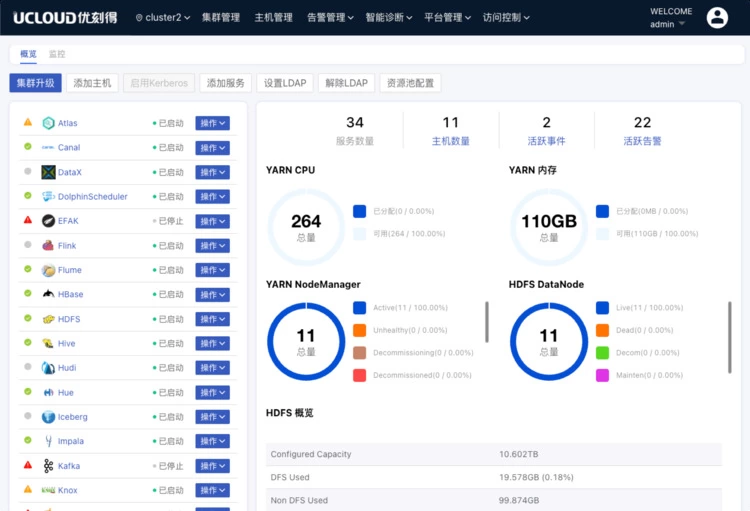 此外,控制台还新增了丰富的集群核心指标展示,用户可以直观地了解YARN集群的计算资源使用情况,包括集群CPU和内存等重要指标。用户还可实时监测YARN集群和HDFS集群的健康状况,了解存储使用情况以及YARN应用程序的运行统计等关键信息。这一切都集中在集群首页,让用户一目了然,从而更好地制定管理策略和进行性能优化。
