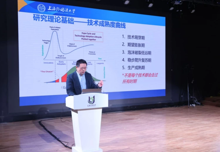以“数字化转型相关技术成熟度调研——大模型、元宇宙、 数字底座”为主题,上海外国语大学信息技术中心主任赵衍在主旨演讲中深入分析了当前热点技术的成熟度,以及这些技术在未来教育领域中的广泛应用。随后详细探讨了元宇宙、大模型、数字底座等技术的最新进展,以及这些技术如何为教育带来革命性的变化。