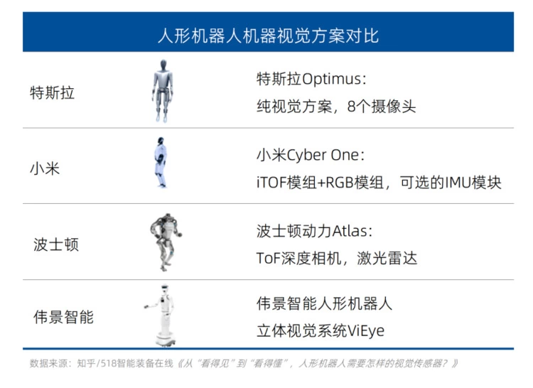 市面上的主流人形机器人通常配备先进的机器视觉系统,结合AI算法和多模态感知能力,以实现全面的视觉功能。举例来说,特斯拉的Optimus人形机器人搭载了8个摄像头,采用了纯视觉技术方案,并通过算法处理图像,实现了物体识别和环境理解等功能。与此不同,小米的Cyber One和波士顿动力的Atlas则利用3D视觉和其他传感器相结合,以实现对周围环境的更全面感知。这些先进的视觉系统使得人形机器人能够更准确地感知和理解周围世界,为其在不同任务和环境中的表现提供了强大支持。